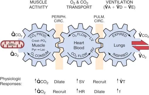 Exercise tolerance is exactly how it sounds - how much exercise you can tolerate until becoming fatigued and having to stop. I’ll primarily be talking about “dynamic” exercise (running, rowing, cycling) which refers to rhythmic muscle contractions of large muscle groups which is characterized by the percentage of oxygen uptake it takes to perform that activity.